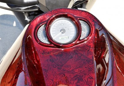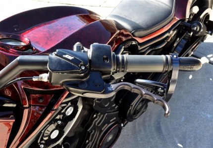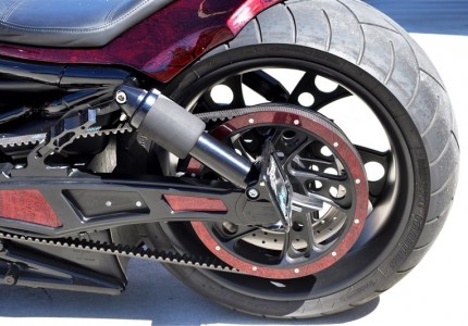 This loaded with high end custom aftermarket parts from top to bottom. Built using components imported from World Famous NLC Customs in Germany nothing on this bike is untouched. The only thing left stock was the frame and engine cases. A super trick billet wide tire swingarm houses a custom cut forged 300 billet wheel with matching pulley and inboard brake. The billet custom front end and triple trees holds a matching custom cut front wheel, rotors and trick 6 piston calipers. Sick see though engine covers show inside the powerful Vrod engine and the short exhaust lets you be heard when rolling out. The custom body kit is sprayed with a candy red bowling ball paint job topping this bad mf’er off in style.