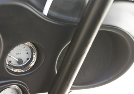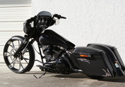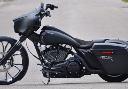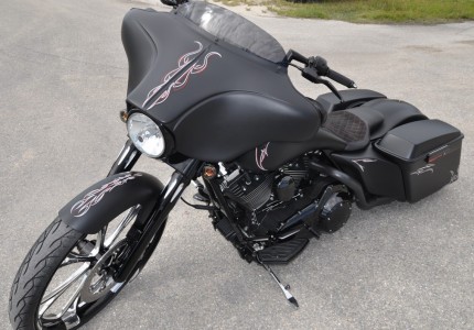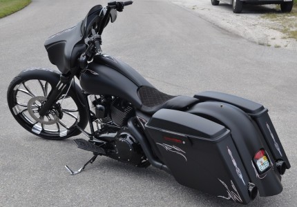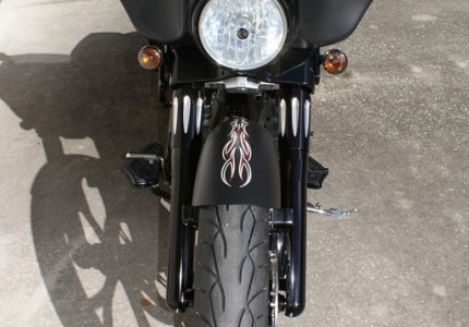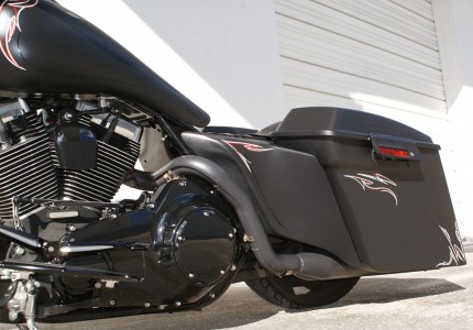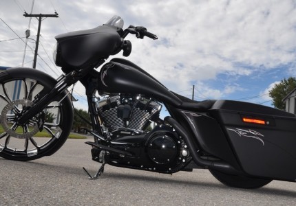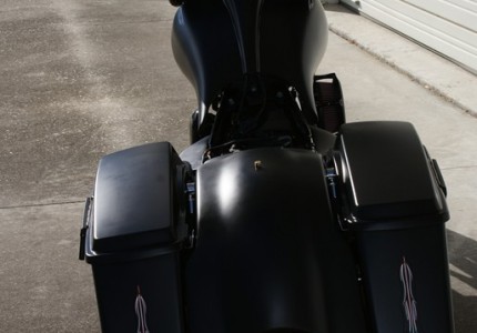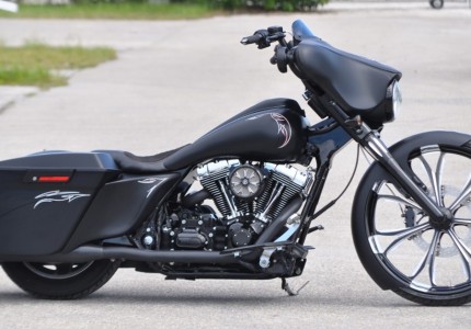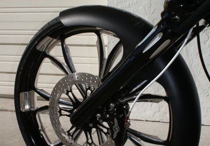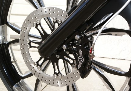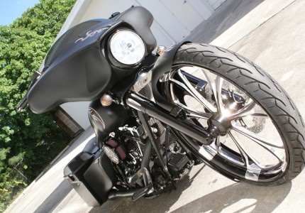 When Ed Hennessey brought his 2008 Harley-Davidson Street Glide to Roaring Toyz all he wanted was a 26-inch front wheel conversion. What Hennessey got was a fully customized bagger to match his stable of custom black vehicles. Roaring Toyz boss Robert Fisher and well known v-twin builder Kory Souza –the resident Harley-Davidson expert at Roaring Toyz – began with a Performance Machine 26-inch Paramount Platinum Finish front wheel. The installation process involved cutting the neck of the frame and welding on a new one that had more rake. The neck was also stretched and raised two inches to make room for the wheel. The triple clamps were replaced with a set of billet raked trees with calculated offset to ensure proper rake and trail on the Street Glide. Even the upper fairing was raked to aim the headlight properly. Finally, the fork internals on the 08 Harley-Davidson were changed to improve suspension with the new wheel. With the wheel in place Fisher and Souza went to work on brakes. A single-disc Performance Machine Paramount rotor was complemented by a six-piston caliper for stopping power. Other improvements up front included a set of Black Anodized Billet Hidden Axle Single Disc Lower Fork Tubes topped with a set of Contrast Cut Billet Cow Bells.