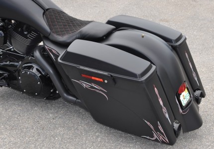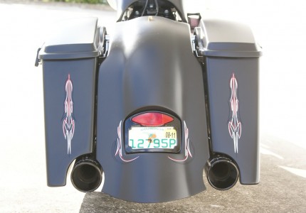 The new 26-inch wrap-style front fender, Vee Rubber tire and custom stainless steel braided brake line—coated in white with red ends—completed the massive front-end conversion on Hennessey’s Street Glide. With a completely customized front it was impossible to leave the rest of the Harley-Davidson stock. The 08 Street Glide got a set of Milwaukee Bagger stretched saddlebags and a stretched rear fender with a countersunk license plate bracket. Thanks to the integrated taillight and turn signals in the bracket, the rear end looks a lot more clean and sleek.