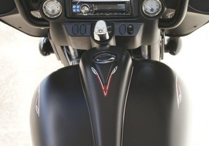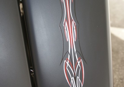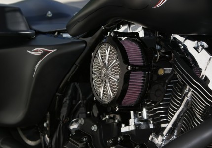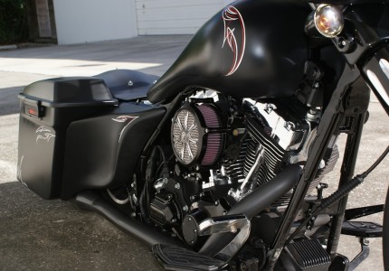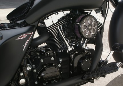 Hennessey wanted his Street Glide to match his other vehicles, so it got a flat black paint job highlighted with white, red and black pinstripes. Subtle, but a head-turner nonetheless. Anyone who knows Roaring Toyz also knows that cosmetic changes aren’t enough to qualify as a full custom. The Street Glide’s horsepower got a boost with a Performance Machine Super Gas Air Intake with a matching Paramount faceplate and a Rhinehart full exhaust. The fuel injection was also remapped with a Power Commander. And what’s a custom bagger without ape hangers? The flat black Todd’s Cycles 14-inch strip handlebars on this build were customized with gloss black pinstripes to match the body. Handlebar switch wires were run inside the bars for a clean look, and the grips are custom contrast-cut billet and rubber beauties.