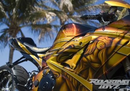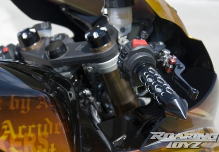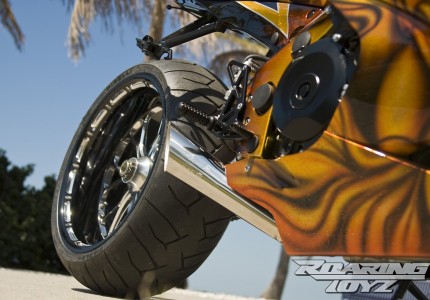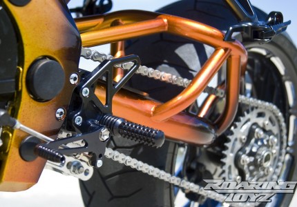Roaring Toyz Billet lowering links were added to lower the bike just a bit compensate for the extra length of the swingarm