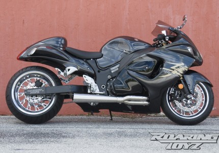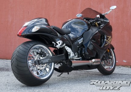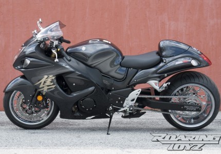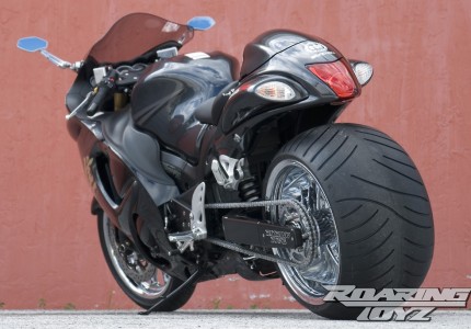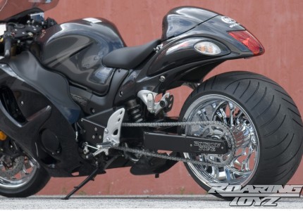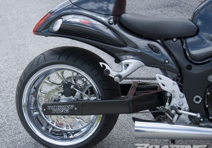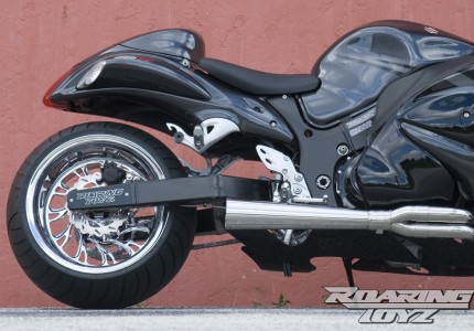 Hot 2008 Suzuki GSX-R 1300 with our new innovative 330 Out Side Drive Kit! We have eliminated the need for a jack-shaft on this new elegant swingarm design thus enabling the wide tire to be fit up under the factory fairing. Available in 4″ – 8″ over configuration or 8″ – 12″ over.