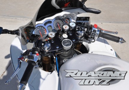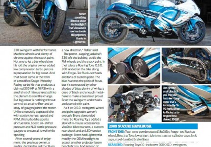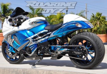 Whoever introduced the notion that life was meant to be experienced in moderation was full of it. Don’t believe us? Have a look at this ‘Busa. This bad dog was built to roll heads, burn tires and drop jaws. Any questions? Take it up with the taillight, because that’s all you’ll see of this force-fed monster if you come a’knocking. “It’s a complete package, that’s for sure, with custom paint, an outside drive stretched swingarm, a turbo kit and plenty of other top-shelf parts,” said Robert Fisher of Roaring Toyz. While the bike could be considered fat-tire perfection, it took a community of gearheads to create it. The first go at building this bike back in 2009 saw a 10-over jackshaft 330 swingarm with Performance Machine wheels and plenty of chrome against the stock paint. Not one to let a big wheel slow his roll, the original owner added low compression turbo pistons in preparation for big boost. And that boost came in the form of a modified Stage 1 Velocity Racing turbo kit that produces a claimed 300 HP at 16 PSI with a small shot of nitrous injected into the plenum to cool the charge. But big power is nothing without control, so an air shifter and an array of gauges joined the roster. Unlike a naturally aspirated bike with coolant temps, speed and RPM, this turbo bike sports air/fuel ratio, boost, air-shifter pressure and N2O bottle pressure gauges to ensure all is well while spooling.