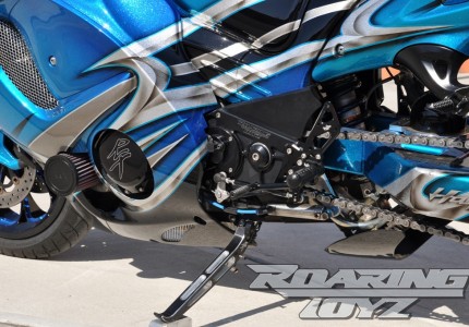The power-sapping jackshaft 330 left the building, as did the PM wheels and the stock paint. In their place a Roaring Toyz O.S.D. 300 landed on the bike along with Forge-Tec Ruckus wheels and tons of custom paint. The blue hue was the point of focus, but it’s contrasted by other shades of blue, plenty of white, a dose of black and enough metalflake to make a bass boat proud. Even the swingarm and wheels are layered with paint.As if an O.S.D. swingarm, wheel and paint upgrades weren’t enough, Evans demanded more. So Roaring Toyz added a slew of in-house accessories: VooDoo billet rearsets, a custom rear shock and an LED/strobe package. Evans had Lightwerkz modify the OEM headlight to accept another projector beam headlight too. And instead of simple halogen bulbs, both projectors received HID kits for plenty of ice-white light.