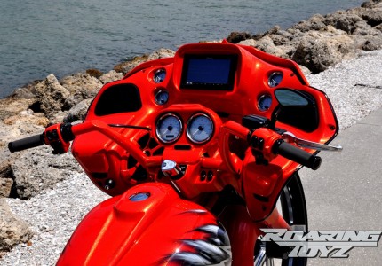 The only thing on The Chief that’s louder than the Yaffe Phantom pipe is the custom sound system. Roaring Toyz partnered with Underground Audio for the build, and the result is a Double Din TV navigation unit molded into the dash, four Phoenix Gold speakers in the front fairing and a ported sub molded into the rear saddlebag.