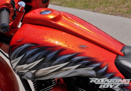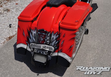There was a lot of real estate on the back end of this custom bagger, just waiting for a custom paint job. Fisher and longtime collaborator Paul Wong decided to use the Roaring Toyz tee-shirt design as the inspiration. The Roaring Toyz badge went on the back, and the wings on the shirt were enlarged so they spread across the bike. The gold, yellow, lime and green pearl flake paint sets off the custom design. There are 48 different pieces painted in multiple layers spread throughout this Roadglide creating a huge layout in the paint booth, not to mention countless hours of prep, spray and detailing. Its hard to explain how much time goes into a paint job like this!